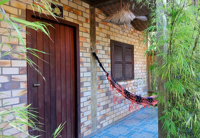 Chalé 3 - Ideal para casal com possibilidade de acomodar até 3 pessoas. Este chalé é composto por um quarto no piso superior com ar condicionado split (frio), ventilador de teto, varanda com rede e vista para o jardim. Banheiro, sala com TV, sofá cama, cozinha completa e varanda com rede no piso térreo. Construção de 2 pisos em alvenaria.